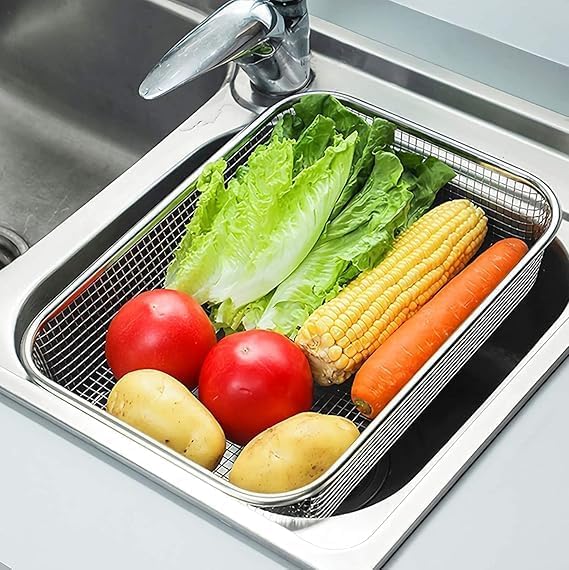 • {OVER THE SINK} - Over the Sink Colander Strainer Stainless Steel for kitchen,Rectangle Stainless Steel mesh Basket, for kitchen tasks including filtering, straining, drying and draining.
