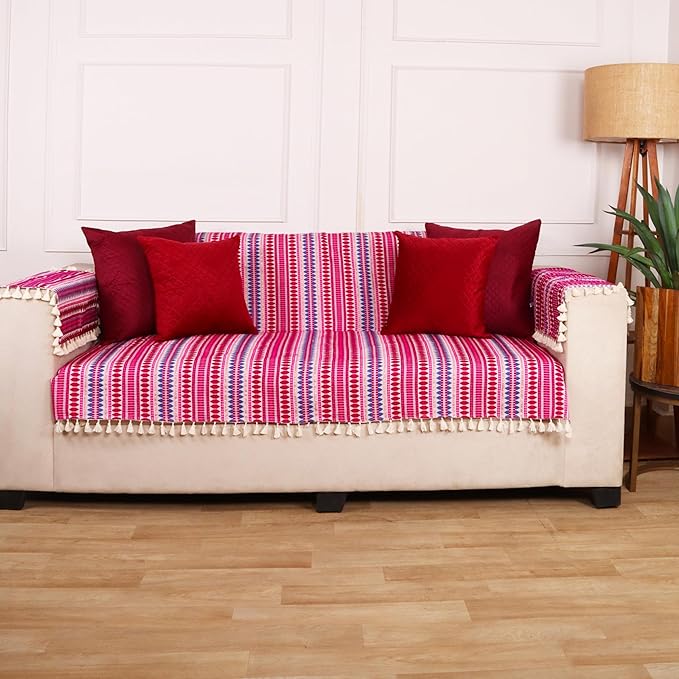 STITCHNEST Woven 1 Seater Sofa Protector with 2 Hand Rest Covers – Purple & White Stripe Design – Washable Fabric with Tassels – Stylish Sofa Cover for Modern Living Room & Furniture Décor