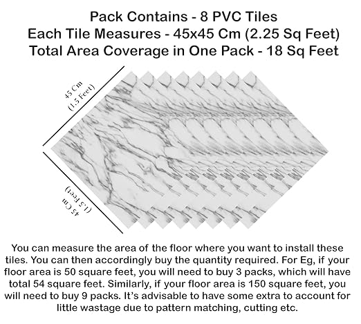 • Each Plank measures 18x18 Inches (2.25 Square feet). Hence you get total 18 square feet in one package