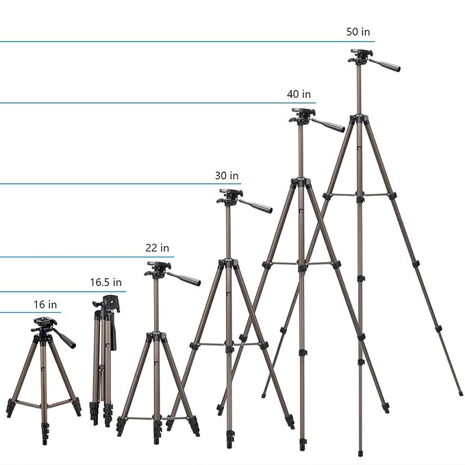 • LIGHTWEIGHT AND COMPACT: Weighs just over a pound. Extends to 22@, 30@, 40@ and 50@. Minimum Height: 16@. Carrying case included.