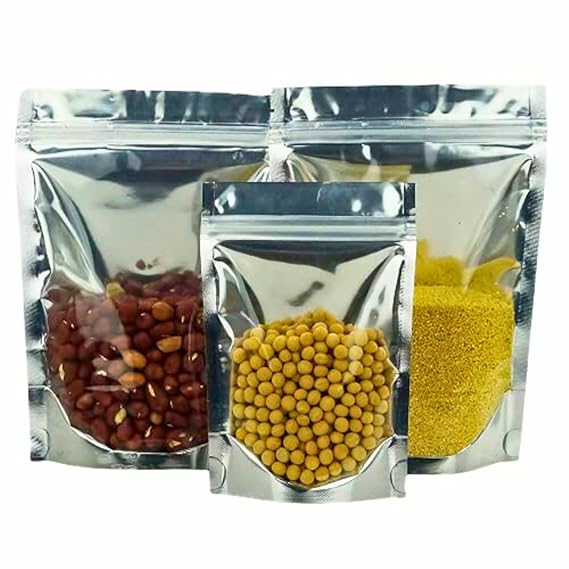 Transparent Front/Silver Back Standup Zipper Pouch | Reusable LDPE Zip Lock Bag for Food Storage | Product Packing Pouch | Size: 5 x 8 Inch (Capacity: 250gm) (20 Pcs)