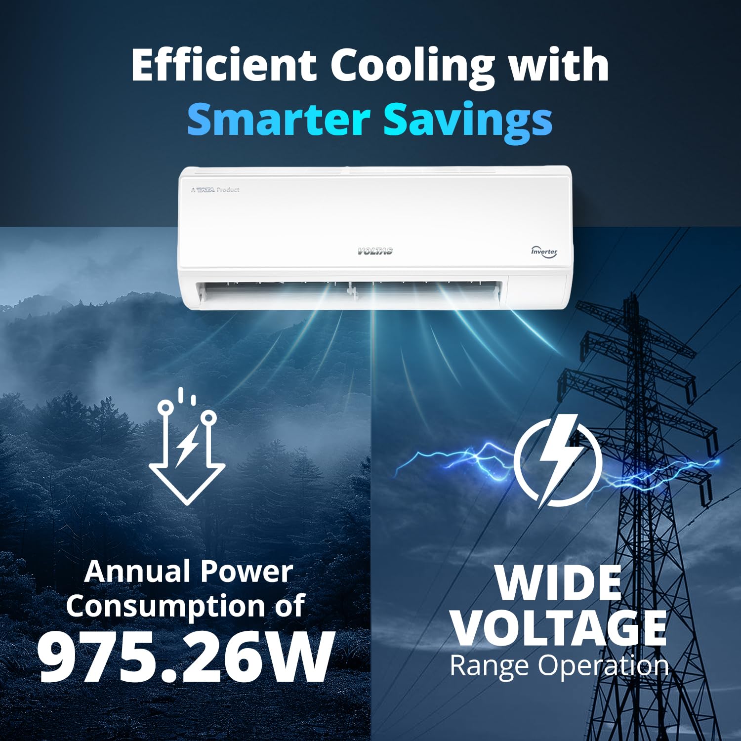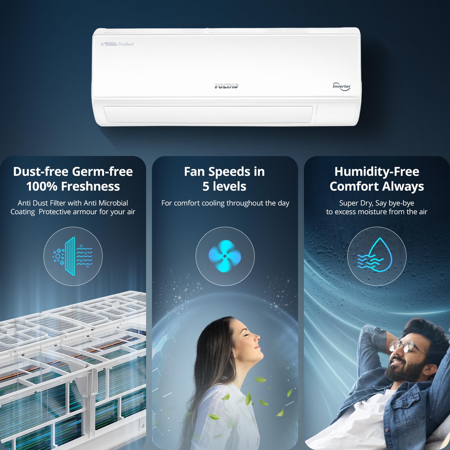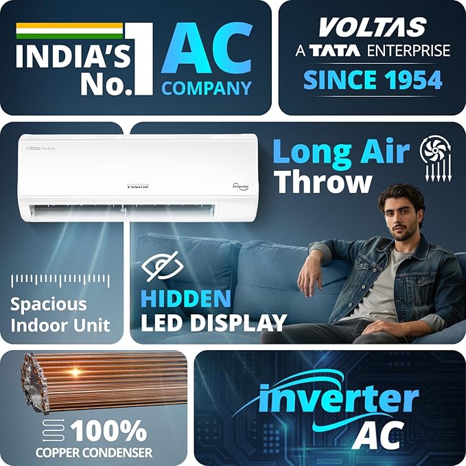 Voltas 183V Vectra CAW 1.5 ton 3 star inverter Split AC|4-IN-1 Adjustable mode|Energy Efficient|High ambient Cooling-cools even at 52°C|Anti dust filter with Anti-microbial coating|Copper Coil| White