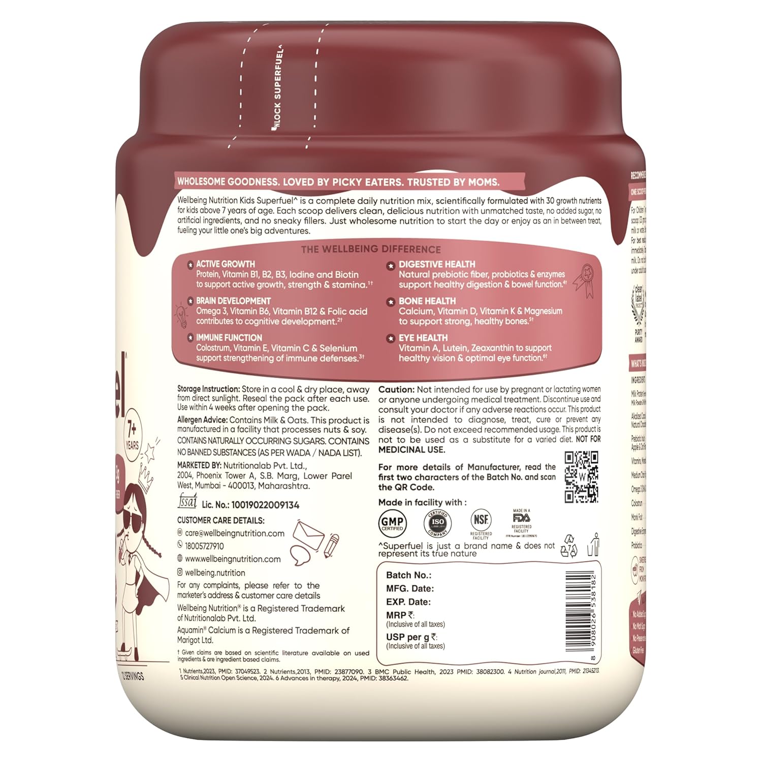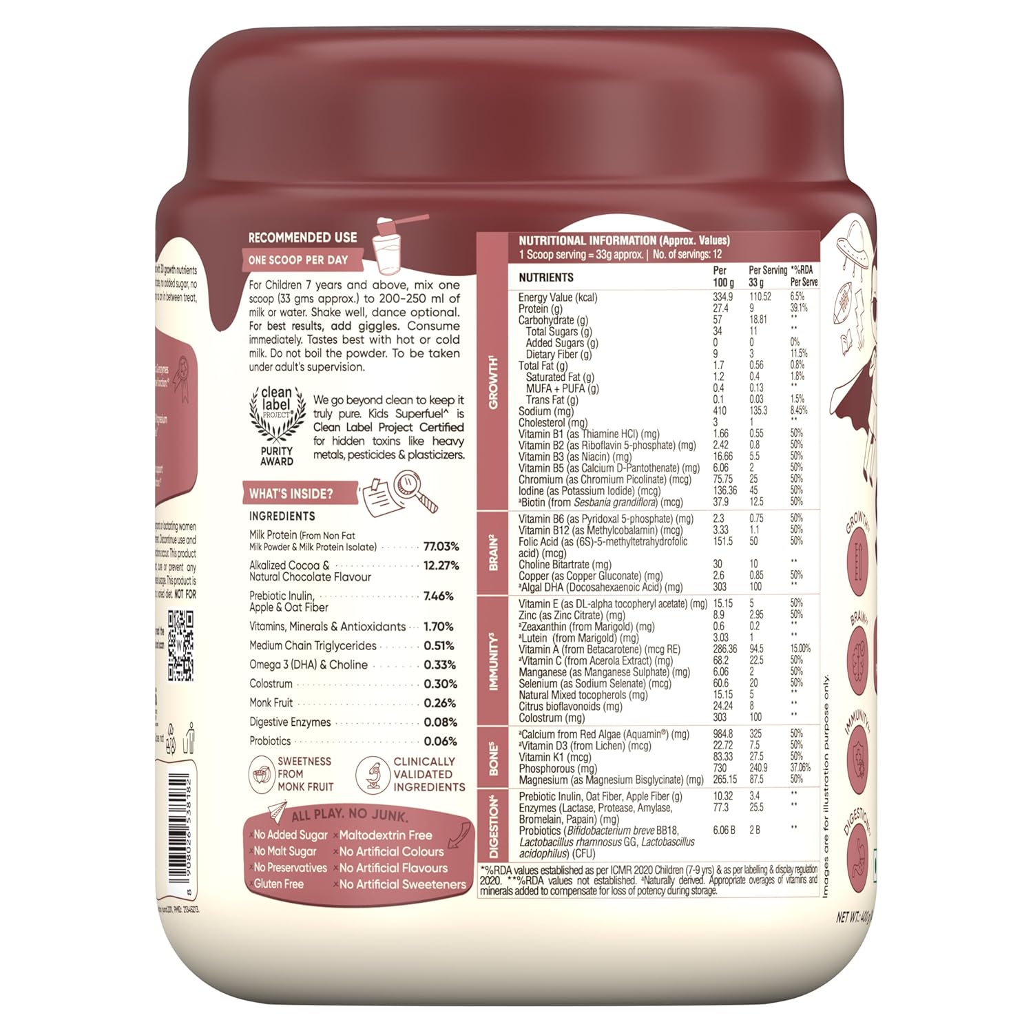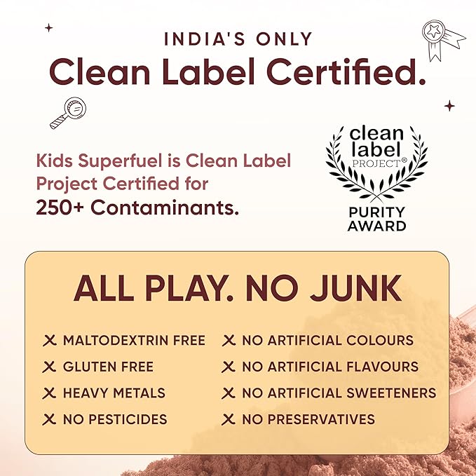• 100% CLEAN. CERTIFIED CLEAN LABEL. TRUSTED BY MOMS Certified by the Clean Label Project for purity and safety, Kids Superfuel is rigorously tested for over 250 contaminants such as heavy metals, pesticides and plasticizers. Crafted with clean, transparent ingredients and free from preservatives, artificial colours and flavours, it delivers uncompromised, parent-trusted nutrition for healthy growth and development. Toxin Free. Gluten Free. 100% Chemical Free..
