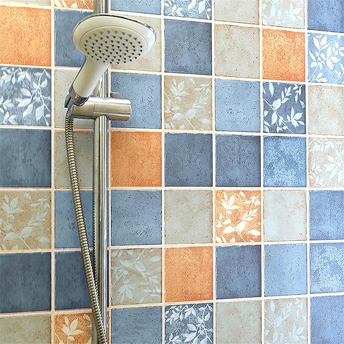 wolpin Bathroom Tiles Wallpaper (45 x 1000 CM, Blue & Orange) | Waterproof Self Adhesive Stove Backsplash Countertop Wall Sticker DIY Bathroom Home Decor Blue Orange Tile Pattern