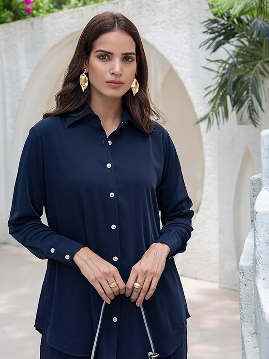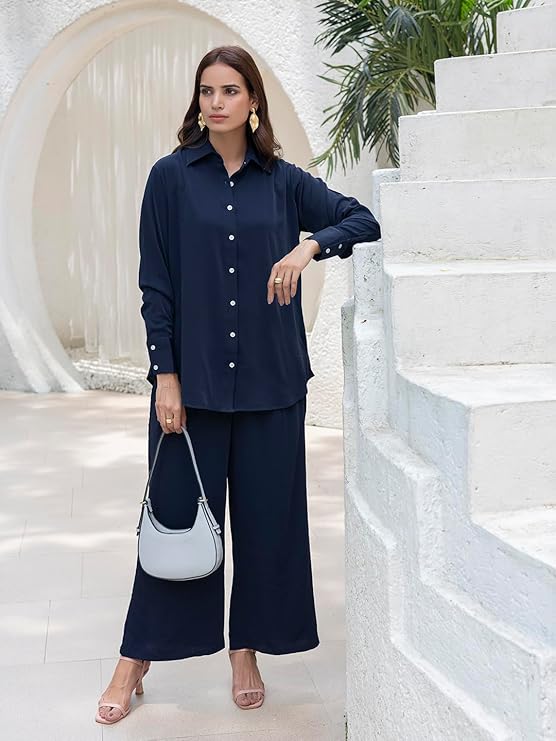 Women Polyester Shirt And Trouser Navy Blue Color Co-Ord Set