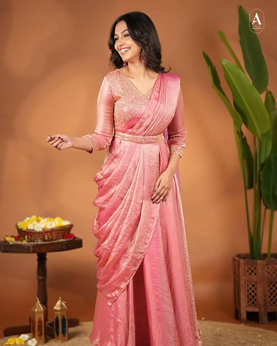 • Elegant Indo-Western Draped Gown: A beautifully designed pink long dress featuring an embroidered bodice and a stylish saree-style pleated drape, offering a modern yet traditional festive look.