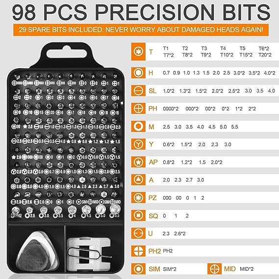 • ➤【98 Screwdriver Heads】 Upgrade version of up to 98 screwdriver heads for more electronic products. A set can solve the repair work of different items, no longer worry about not finding the right repair tools.
