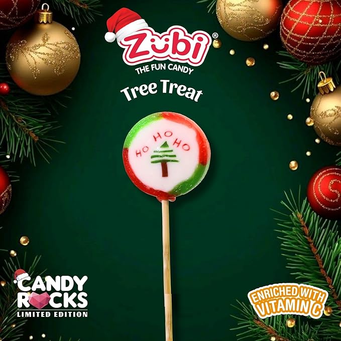 • Celebrate the joy of Christmas with Zubi Candy! Our festive Christmas tree lollipop is handmade with love and enriched with Vitamin C. The delicious kiwi flavour makes this a treat fun for the whole family. Make Christmas sweeter with Zubi!